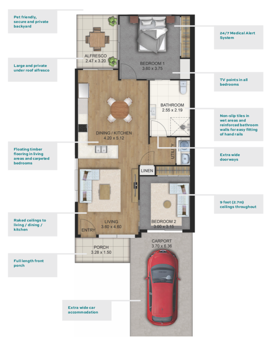 The villa features accessible bedrooms with the master opening directly onto the alfresco terrace and includes an accessible bathroom, while the versatile second bedroom can also be used as separate living area or craft/activity room if required.